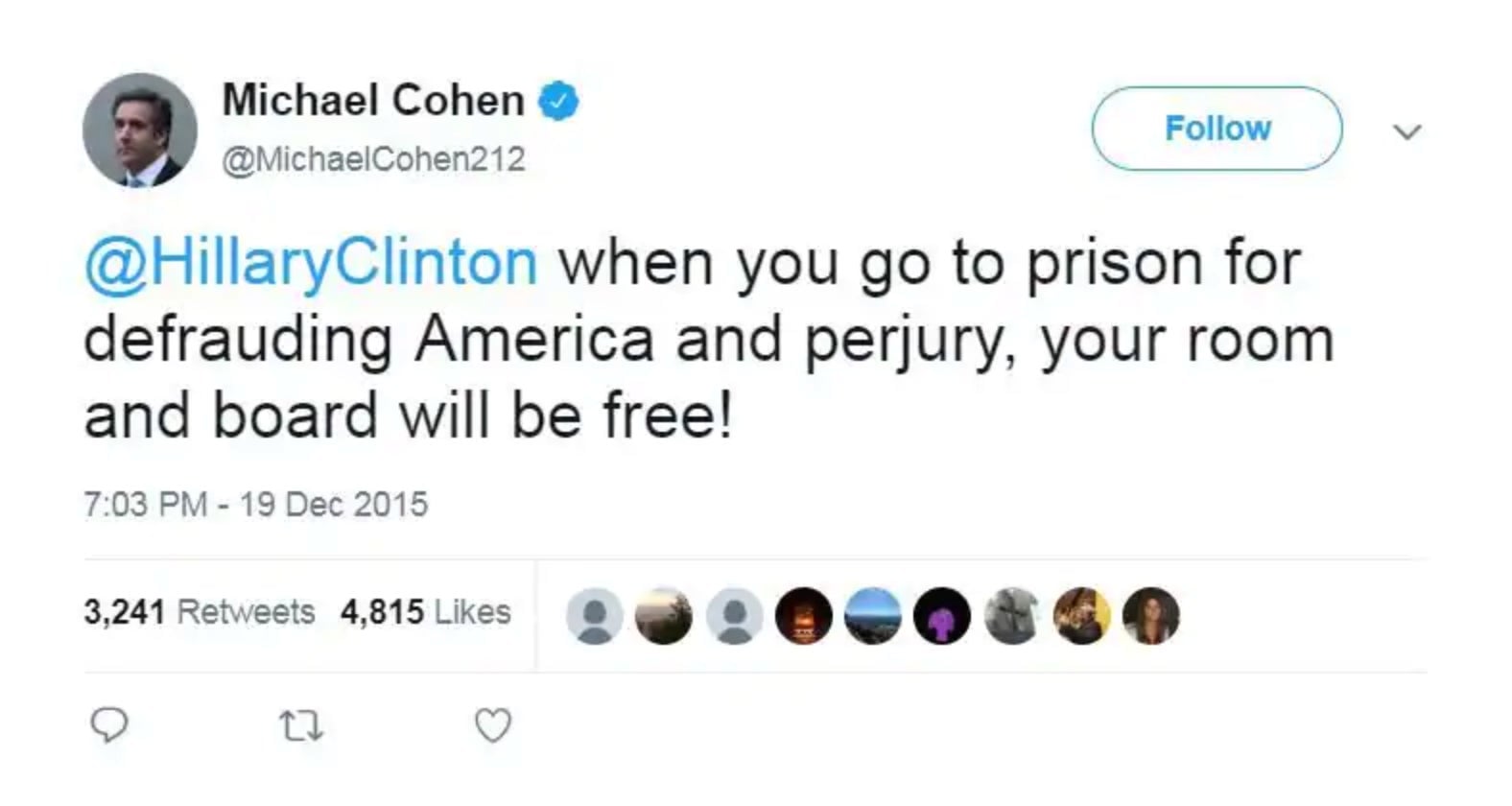Cohen tweeted “@HillaryClinton when you go to prison for defrauding America and perjury, your room and board will be free!”