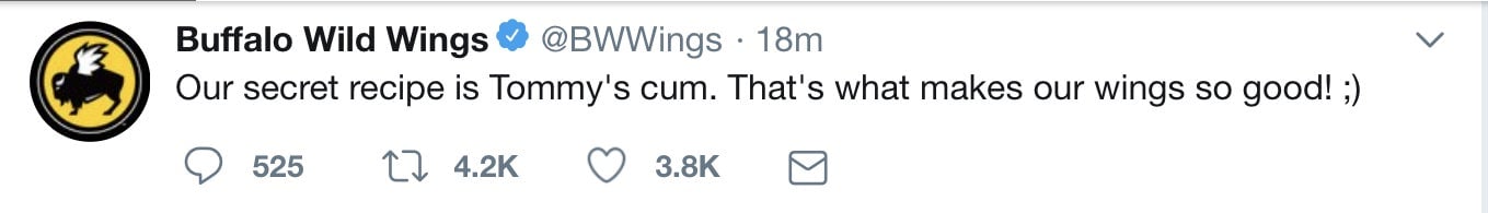 “Our secret recipe is Tommy’s cum,” one of the tweets said. “That’s what makes our wings so good! 😉