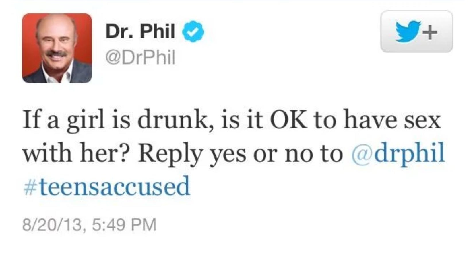 “If a girl is drunk, is it OK to have sex with her?” Dr. Phil tweeted in 2013. “Reply yes or no to @drphil #teensaccused”