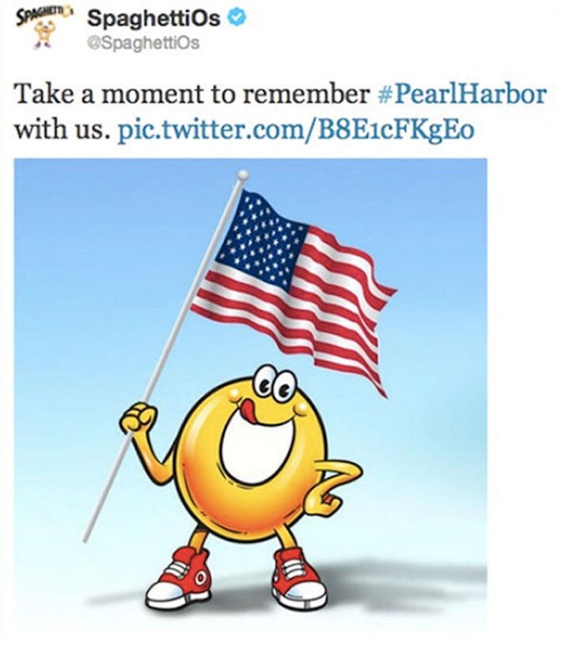 For the 72nd anniversary of Japan’s attack on Pearl Harbor, which finally pulled the U.S. into World War II, the canned pasta brand sent out a tweet with their mascot holding an American flag.