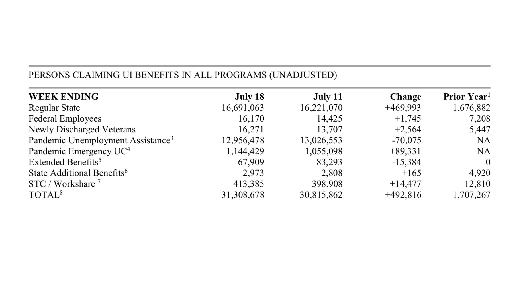 According to data released today by the Department of Labor, about 500,000 more Americans went on unemployment between July 11 and 18, pushing that number above 31 million in total. In economics, it’s sometimes the case that big number equals good. This is not such a case.