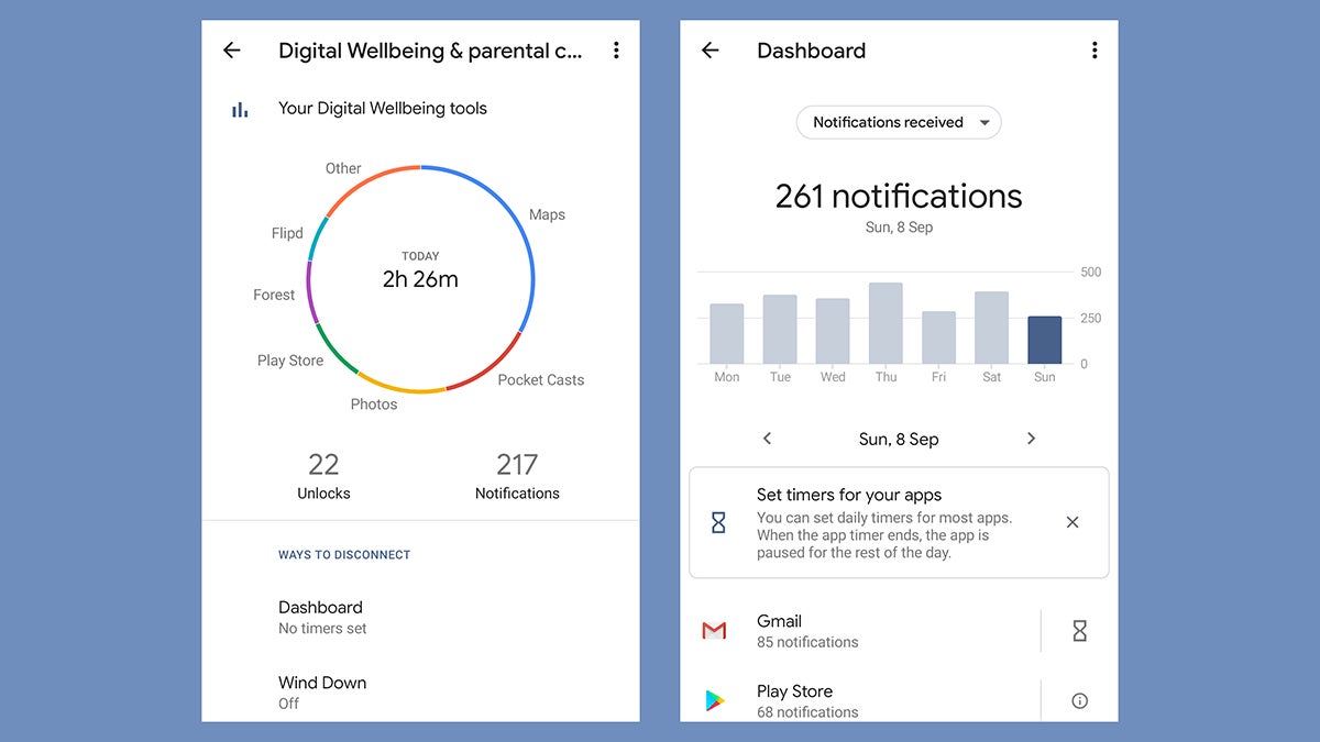 We should also mention the native options now built into Android and iOS. On Android, we have Digital Wellbeing, available here if it doesn’t come with your phone: the portal covers everything from restricting how many minutes you can open up Snapchat and Instagram per day, to breaking down just how many notifications you’re getting from each of your apps. It’s both a sobering summary of your smartphone use and a tool to help you tackle it.