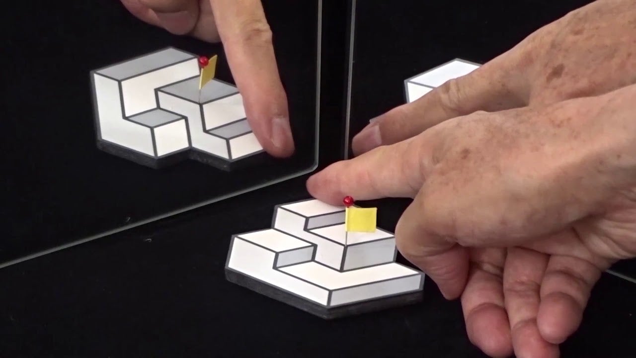 But when viewed from other perspectives, as this video demonstrates using a pair of mirrors, the object appears to be a completely different structure altogether, with the flag somehow simultaneously appearing in other locations. A clever use of shading, and how the 2D image has been illustrated, tricks the brain into thinking it exists in 3D. As the viewer’s perspective changes when looking at the object from different low angles, which makes its lines appear slanted, the brain interprets those visual cues differently, producing three alternate 3D layouts for the object’s various platforms and protrusions.