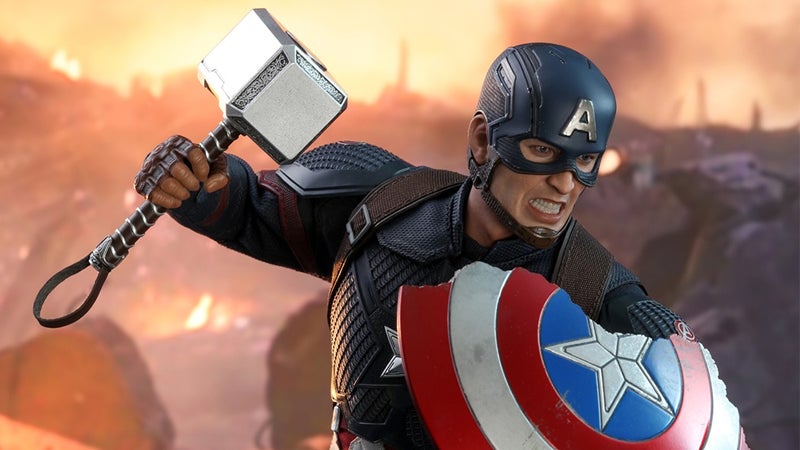 Hot Toys had already revealed its Endgame version of Captain America a while ago, but now that Marvel has lifted its “official” spoiler ban on the movie, the company has revealed that Steve will come with two highly anticipated bonus accessories: his shattered shield, based on the damage Thanos inflicts upon it in a ferocious assault in the movie’s final battle, and, of course, Mjolnir—the weapon of a truly worthy hero.