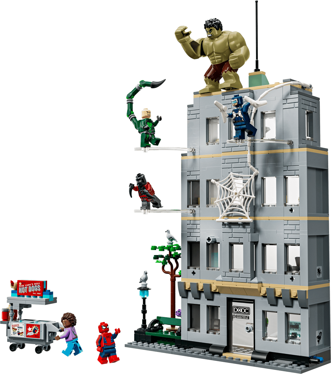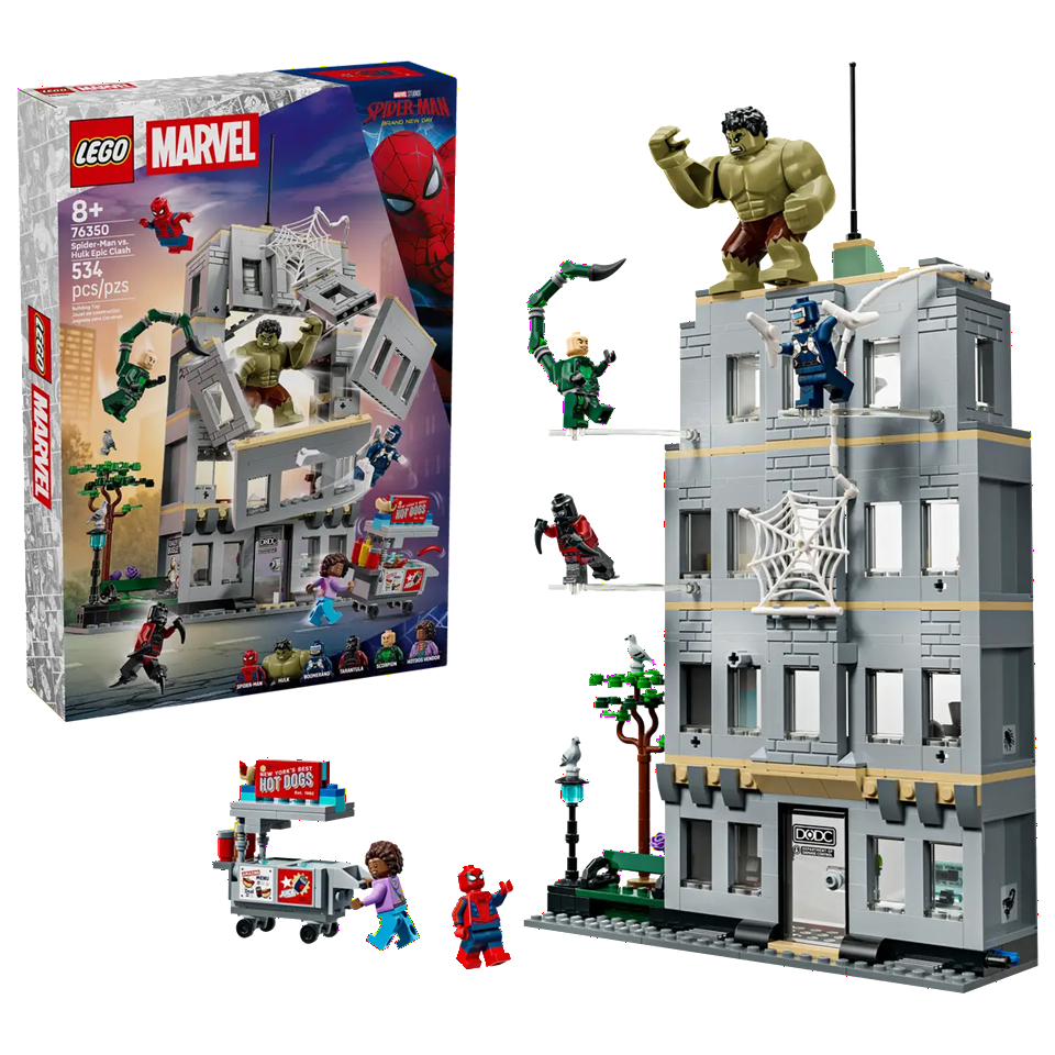 Spider-Man vs. Hulk Epic Clash” teams Peter with the strongest Avenger to fight Scorpion, Tarantula, and Boomerang to save a hot dog vendor. A trigger in the building’s rear makes the 534-piece set’s front blast open to reveal the large Hulk figure, and posting sticks will let you put characters on the DODC building’s upper levels to simulate midair fights.