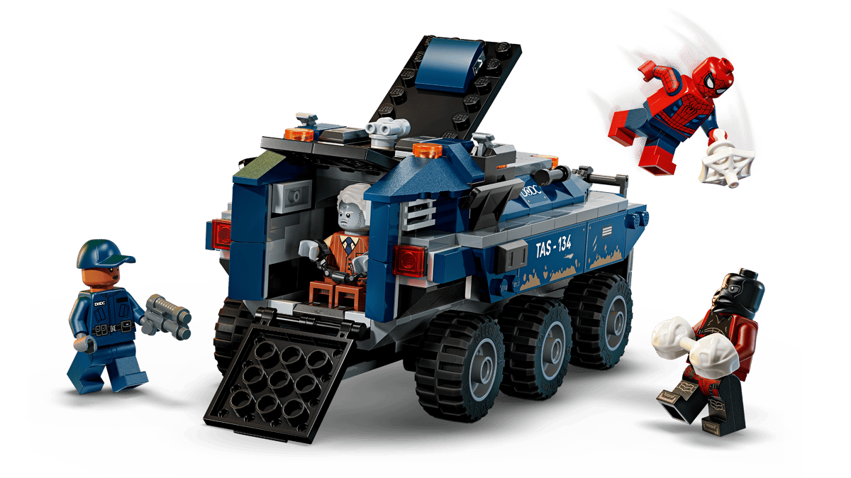 Revealed a few days ago, buyers can look forward to two sets and one figure based on the film. The first set, “Prison Transport Chase,” comes in 367 pieces and has Spidey going up against Tarantula and Tombstone, with a DODC guard along for the ride. Users can build the transport and have it so that Spider-Man’s trying to stop Tarantula from busting out Tombstone, or he’s fighting both enemies and protecting the guard at the same time. Since we know Spidey fights ninjas in the prison at some point in Brand New Day, think of the toy as a potential appetizer for that setpiece.