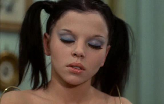 Made in 1970, this European trainwreck of filmmaking features fashion statements that would make Lady Gaga faint, plus nonsensical storylines and horrendous special effects. There are two Devil Twins who wear outfits made out of windchimes, or panties with metal spikes coming out of them. (At one point, the Devil Twins get obsessed with grooming a baby cheetah pelt, complete with cheetah head.) There are dancing girls with fang pasties. There are strange laboratory experiments, in which people wearing animal heads and weird velvet hoods remove blood from naked hooded women. There’s a Suicide Cult in which anyone whose picture appears on the overhead projector is forced to shoot him/herself. And so on.