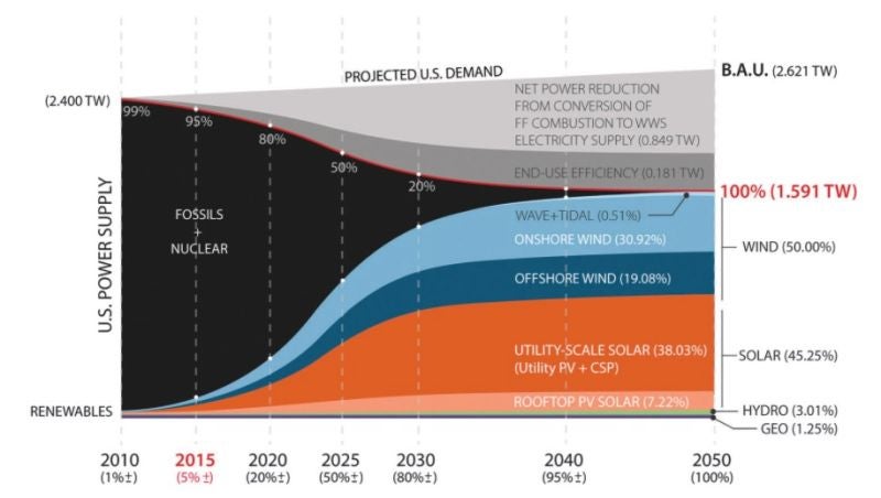 This graph outlines a proposed plan to switch all energy in the US to renewable sources by 2050. Image via Mark Z. Jacobson / Stanford