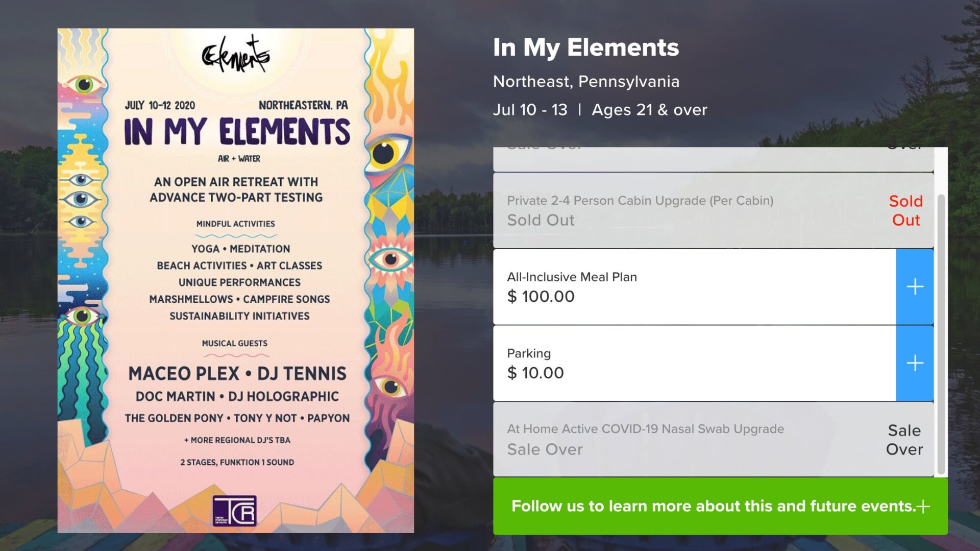 The In My Elements retreat (not to be confused with the related upcoming Elements festival headlined by Diplo, slotted for September) advertised an exhausting covid-19 prevention strategy, with a minimum of two tests. Three days before the event, ticket buyers would either drive to or be delivered mandatory covid-19 tests (incorporated in the ticket price at $147) with results produced within 24-48 hours. Upon arrival, guests were to be greeted with a nasal swab and wait 30 minutes for results, which determined whether they proceed to the grounds or they and the people in their car are sent home. Everybody was promised their own cabin and a private bathroom. If it rained, guests would gather in indoor structures at 50 percent capacity. Stages were said to be plein-aire, with six-foot distance markers on the dance floor. Medical staff were said to be on round-the-clock standby, and anyone showing symptoms could take another test.