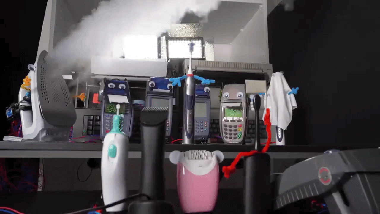 A googly-eyed steam iron—joined with a slew of googly-eyed bandmates including electric toothbrushes, credit card readers, typewriters, a body trimmer, an epilator, and a nail polishing device—played its inanimate little heart out on Saturday during a rendition of “Ghostbusters” by YouTuber Device Orchestra.