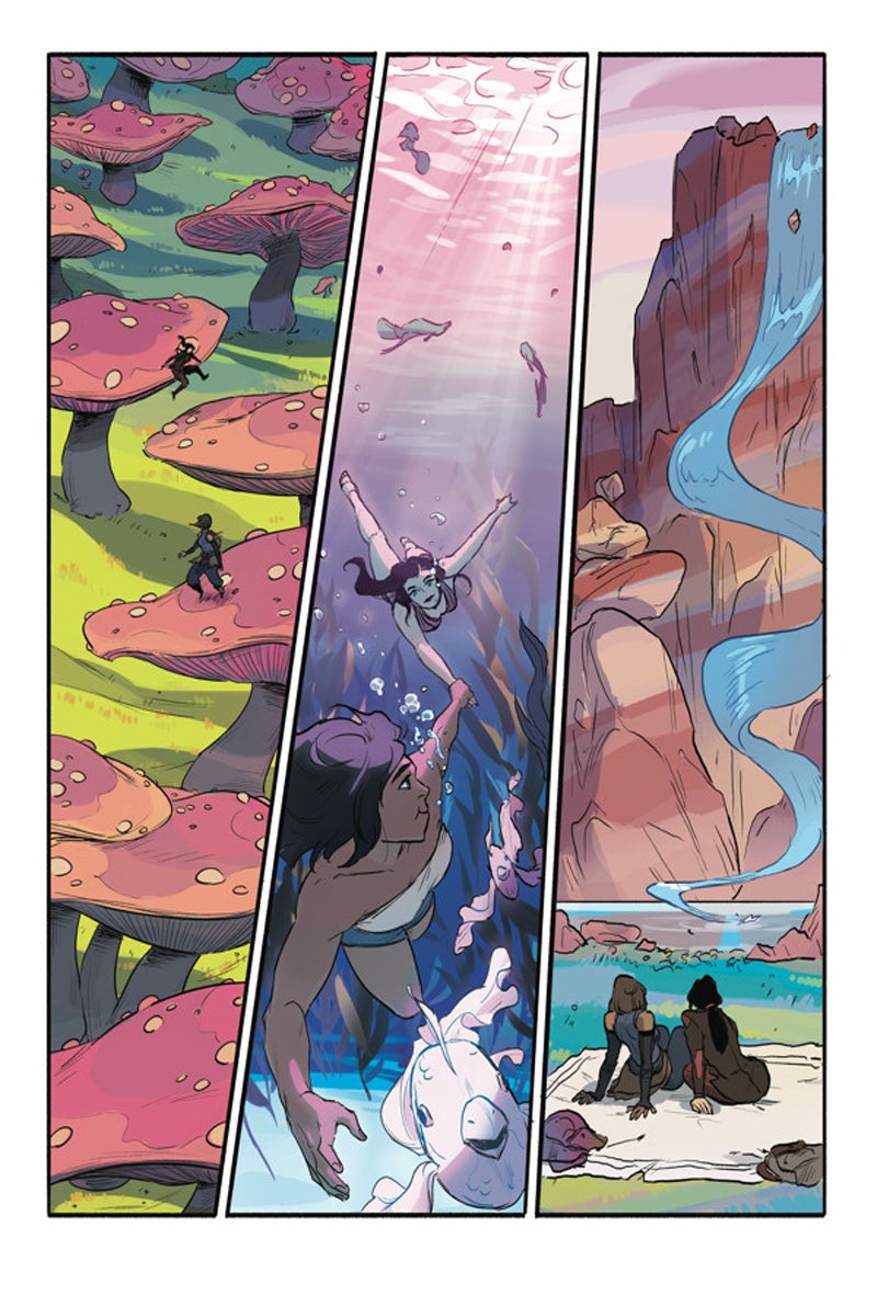 Another thing that feels wonderfully familiar about Turf War is its art. Irene Koh strikes an excellent balance between feeling familiar to the style of the TV show while also being a bit more relaxed and loose, giving the book its own sense of style. It’s effective at depicting both tender character moments and kinetic action sequences that wouldn’t feel out of place among the highlights of Studio Mir’s oft-lauded animation. Paired with Victoria Ng’s sumptuous color work—which adopts a much warmer palette compared to the show—it leads to some really vivid, sumptuous vistas, especially in scenes set in the spirit world. Turf Wars never feels disconnected from its source material on an aesthetic level, something that can often be a challenge for licensed comics. It all comes together to create a comic that feels right at home in the world of Legend of Korra.