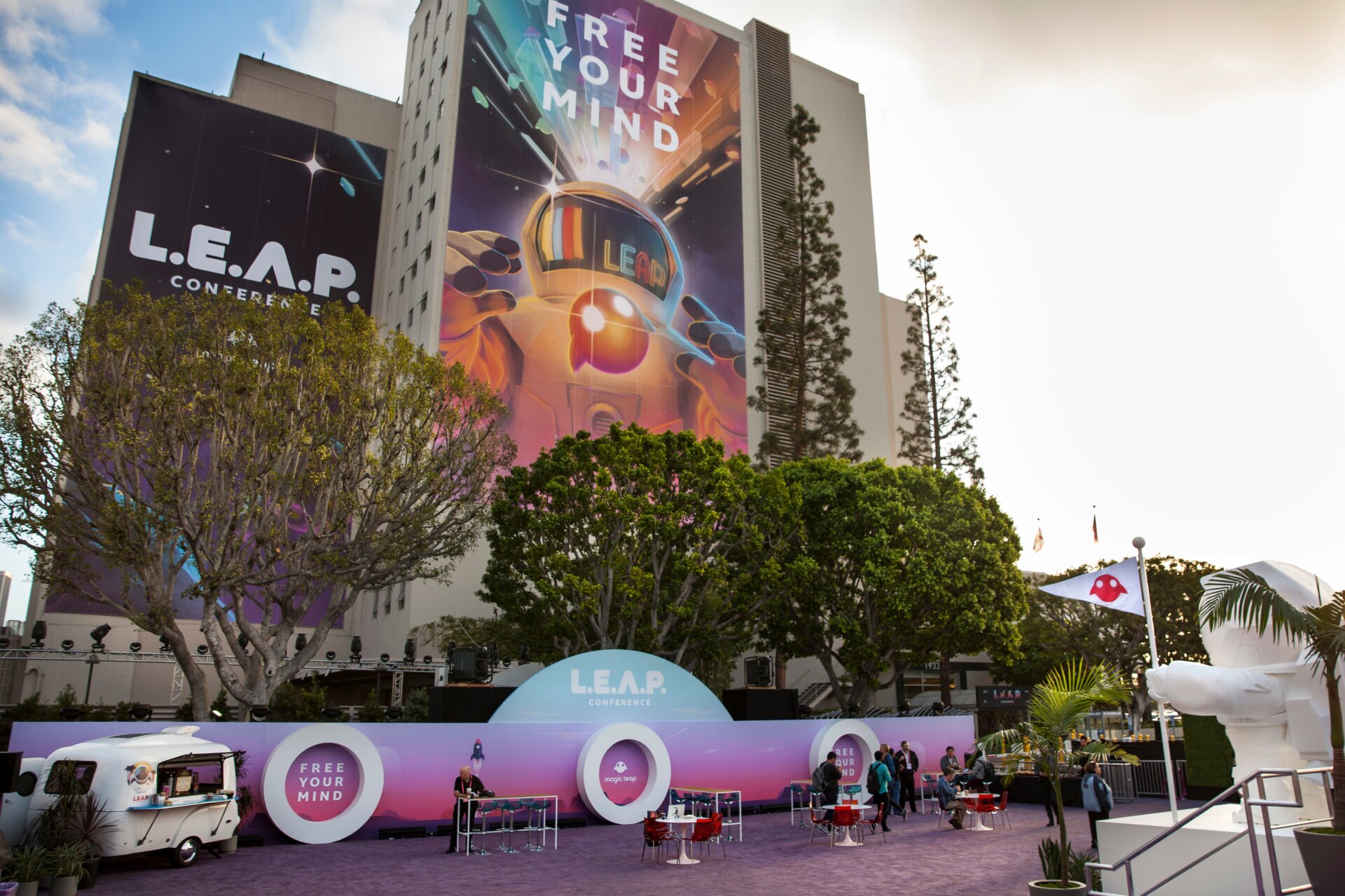 Magic Leap clearly wants its public launch to appear huge—who wouldn’t? In decidedly Magic Leapian fashion, the company covered an entire side of LA Mart, the 12-story building in downtown Los Angeles where the conference was to be held, with a psychedelic image of an astronaut and the tagline ‘Free Your Mind’. In similarly Leapian fashion, the actual demos and keynote took place in the basement, where a wrong turn could land you in shipping and receiving and cell reception was nil.