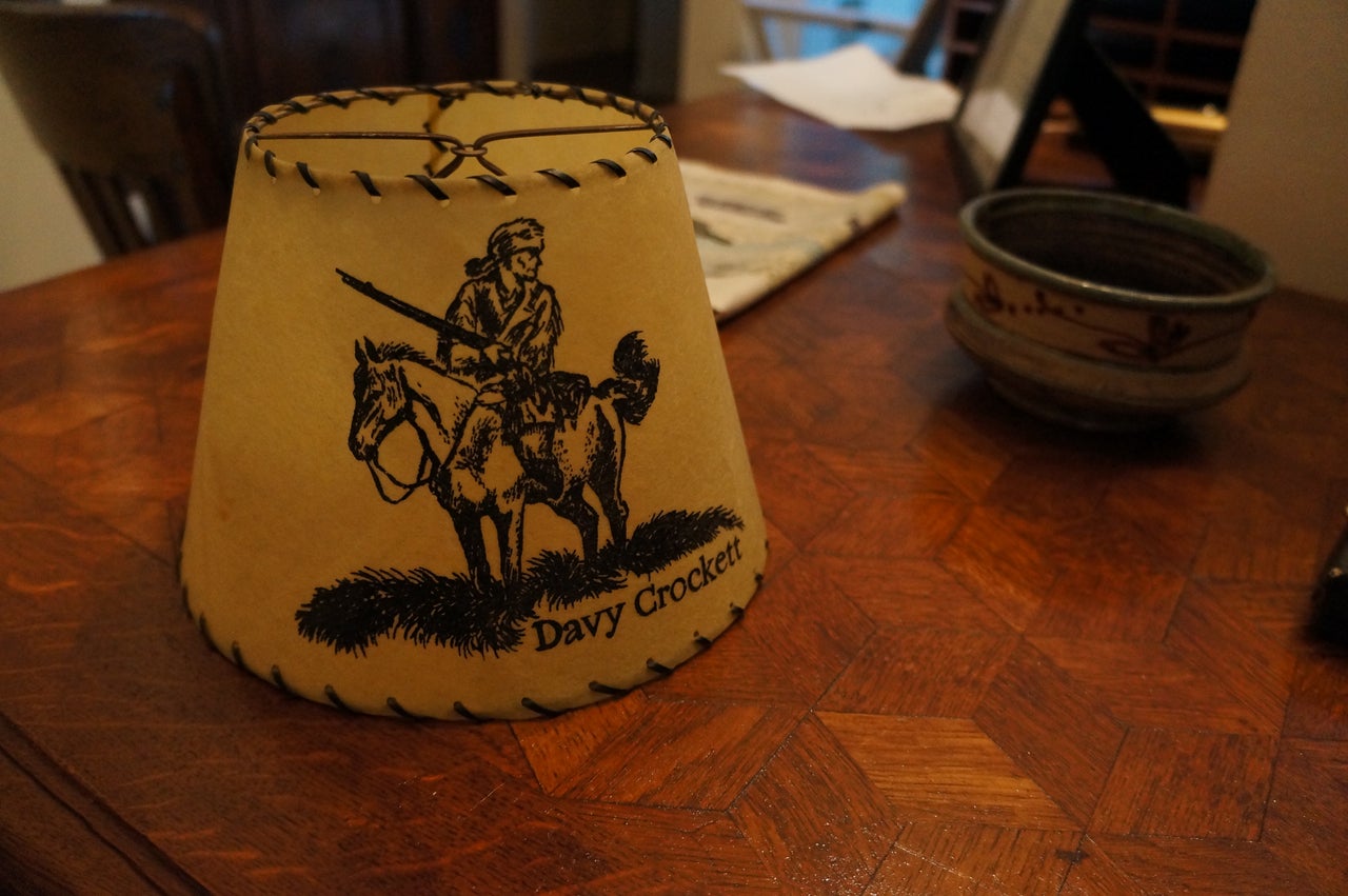 Davy Crockett lampshade and Synanon ceramic bowl sit on a desk in Paul Morantz’s home photographed by Matt Novak (2014)