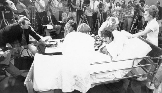 Paul Morantz in his hospital bed during a press conference after the snake attack (1978)