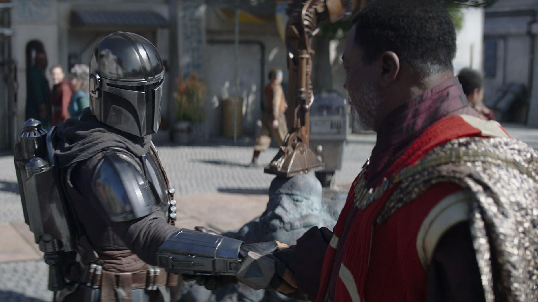 The addressing wouldn’t be so jarring if not for its repetition, or if it was the only jarring thing about The Mandalorian’s dialogue. Rarely does it feel as if people in a scene are talking to each other, but more like at each other, relaying expository information as brusquely and barely as possible. These are good actors—look at what Pedro Pascal has been doing in the run up to this season on The Last of Us—but it’s inherent to the nature of the dialogue itself. It’s clipped and spartan, and any moments of warmth or familiarity come from little flourishes and offhand remarks—like the way Din exasperatedly tries to get Grogu to stop hugging the Anzellan droid engineer.