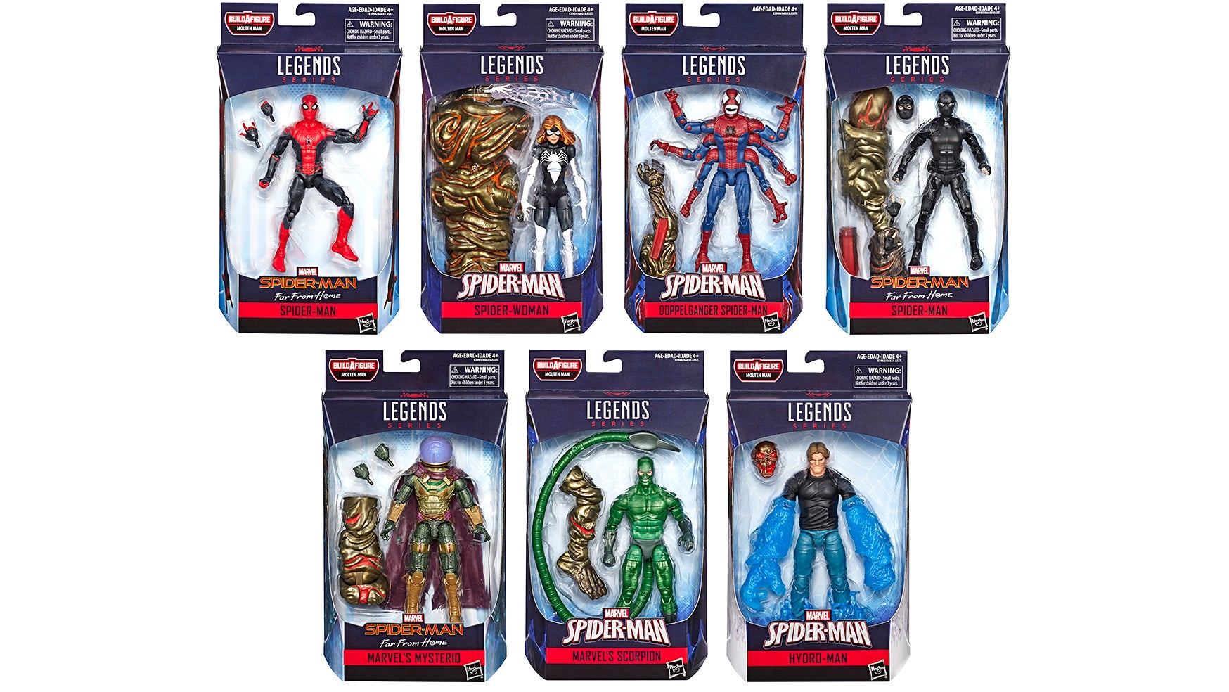 Only three of the wave’s seven figures are actually based on the film—the aformentioned Mysterio, and two Spider-Man figures based on the new outfits Peter wears in the film: the all-black stealth suit, and the darker-toned new take on his Homecoming costume. Getting those figures, as well as ones based on the comic book versions of Hydro-Man, Scorpion, Spider-Woman, and Doppleganger Spider-Man will net you all the molten, golden, and very mushy looking parts needed to build a plus-sized Molten Man figure.
