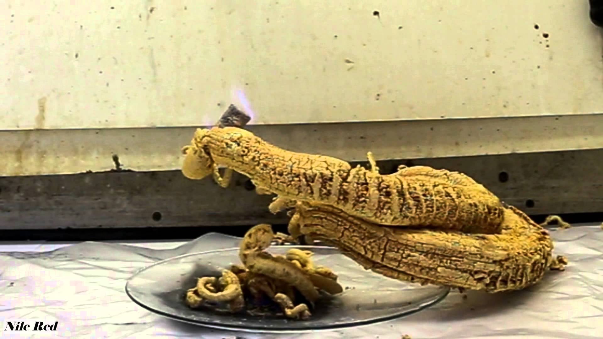 It starts off as a white power but when heated up, “a rapid exothermic reaction is started which produces a large mass of coiling serpent-like solid.” AKA that’s why there’s an ugly ass snake coming up from the ground.
