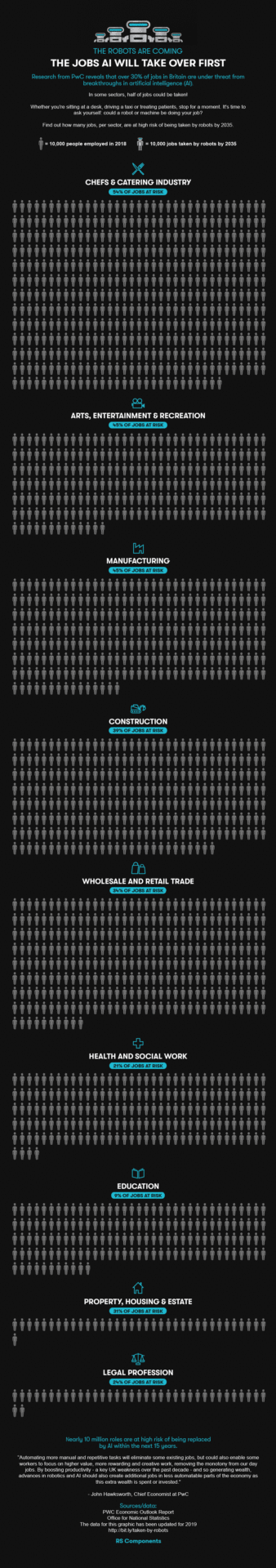 To them, I would submit this one additional piece of evidence—I just received an email pitch with the subject line, “The jobs that AI will take over first.” The pitch was offering me a GIF that depicts data “analyzed” by a company called RS Components that visualizes how many jobs will be replaced by machines with a flashing graphic where human icons are replaced by robotic ones.