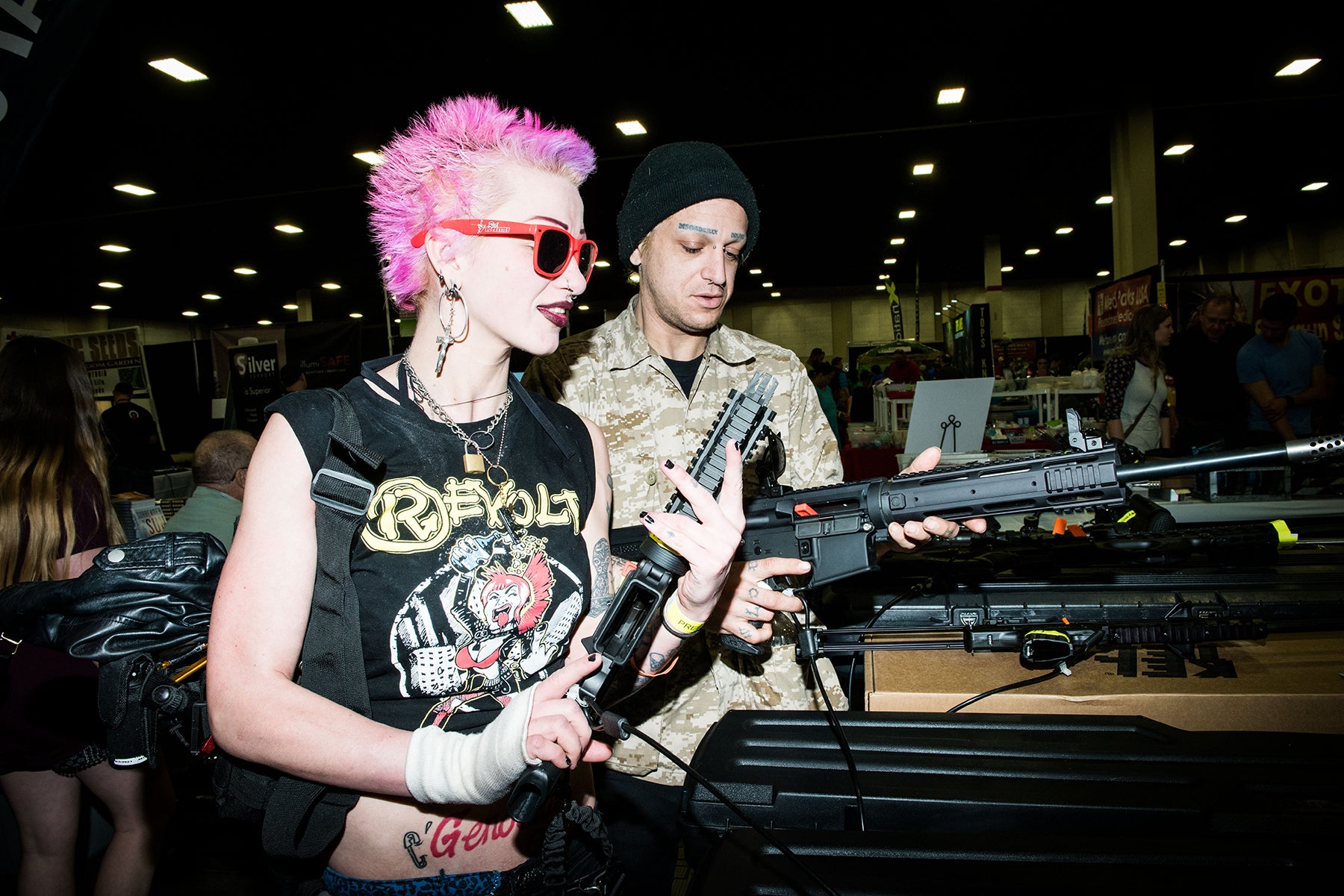 It’s a fantasy only broken by the few people with overtly political messages, like the gun vendors, selling “Lock Her Up” shirts a few feet down from the assault rifles. Or that one vendor who wears a pair of Confederate flag suspenders as he gives out ammo advice and complains about “fake news.”