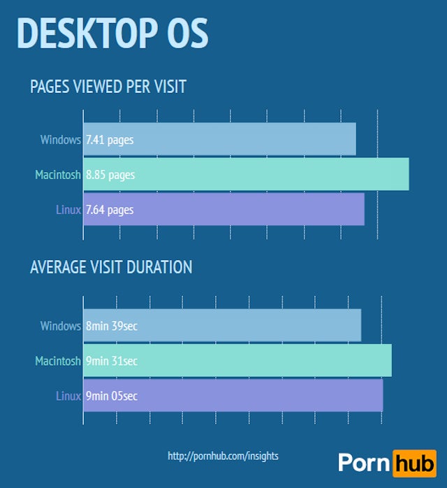 Lets start with porn’s more traditional domain—the desktop. 11 percent of users come in from Macs, which doesn’t seem like all that many until you realize that only six percent of all desktops are currently running OS X. Way to punch above your weight, guys!