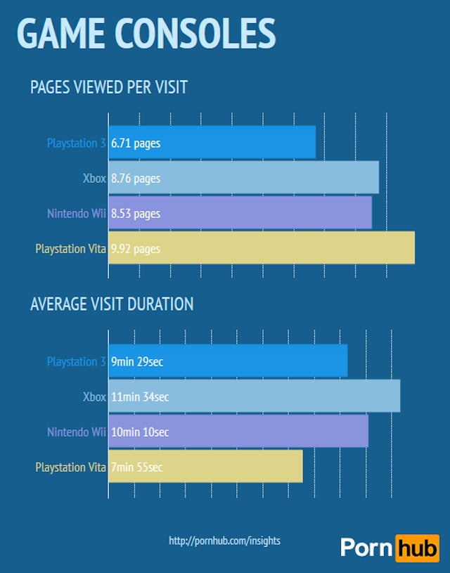 PlayStation users can teach us a thing or two about efficiency, whether they’re firmly grounded or free to roam. Both PlayStation 3 and Vita users clocked in as the speediest gamers, although Vita users really go above and beyond the call of duty. Averaging in at around 10 pages per visit, they still manage to finish the job in just under eight minutes—a full minute and a half faster than any other gamer out there.