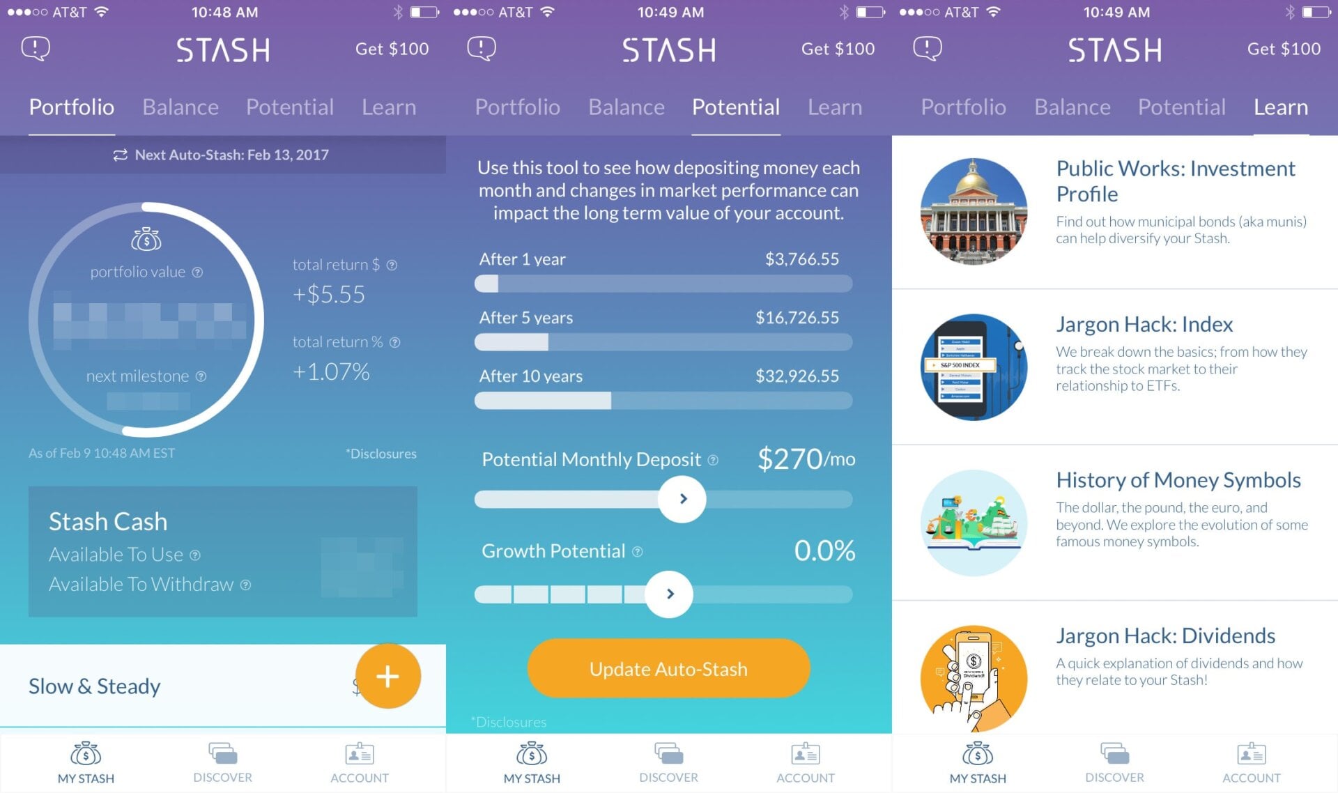 This is where the savings-versus-investing line starts to blur. Stash works a bit like Acorns insofar as the app let’s you set up regular deposits and easily invest that money in stocks and bonds. There’s no round up feature, unfortunately, and it takes a little bit more effort to pick your investments, since Stash lets you choose between packages like “Roll With Buffet” or “Slow and Steady.” If you’re like me and don’t know shit about investing, there are some little tutorials to help. I’ve honestly never read them, but they’re there!