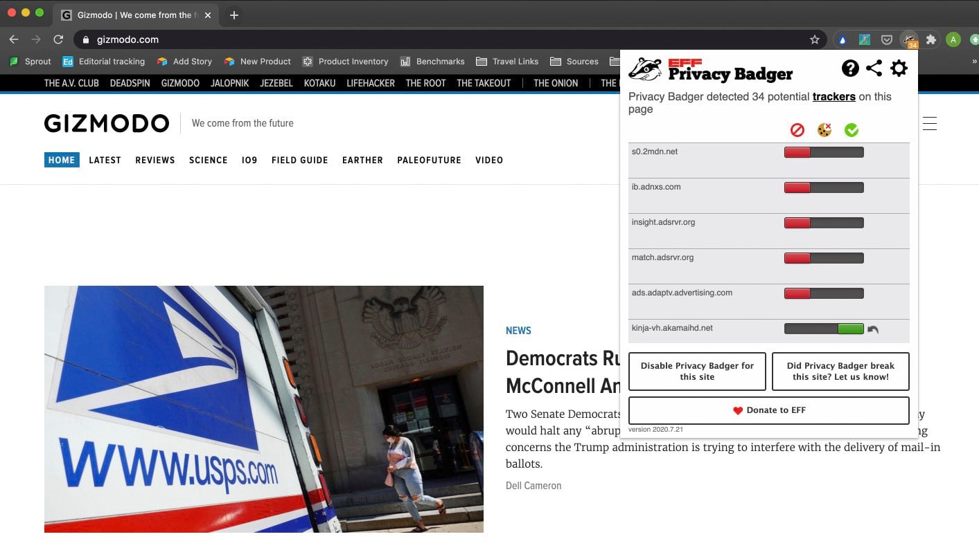 As you might already know, DuckDuckGo is much more than just a privacy-focused search engine these days—this Privacy Essentials extension for all the major browsers not only gives you the names of the trackers it finds on a particular page, it can also attach them to a specific company or website, and identify the worst offenders. It’ll also look for and link to a site’s privacy policy, giving you more information about how it tracks its users, and gives every page you visit an overall privacy grading (with and without ads blocked).