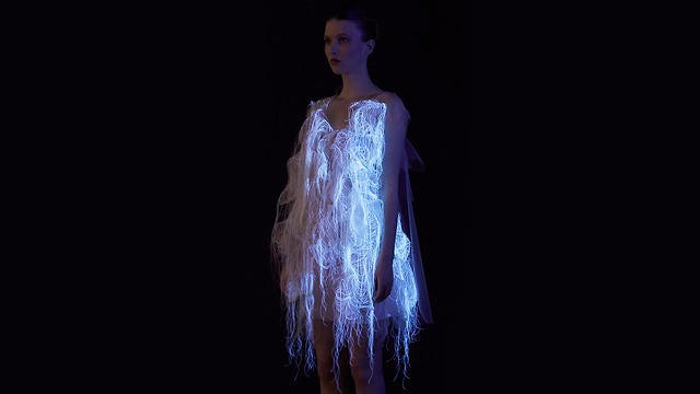 Called (No)where and (Now)here, the dresses use an eye-tracking system to detect when a spectator is looking. A person’s gaze activates tiny motors that move parts of the dress in any number of patterns. The system can also turn off the lights and illuminate the dresses.