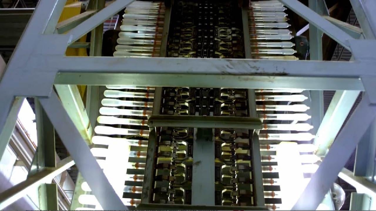 The mesmerizing process includes reams of phallic glass molds being dunked into tubs of latex to form the condom, a steel shaft that tests each condom’s structural integrity by shooting electricity through it, and still more phalli-rods used to lubricate the rubbers.