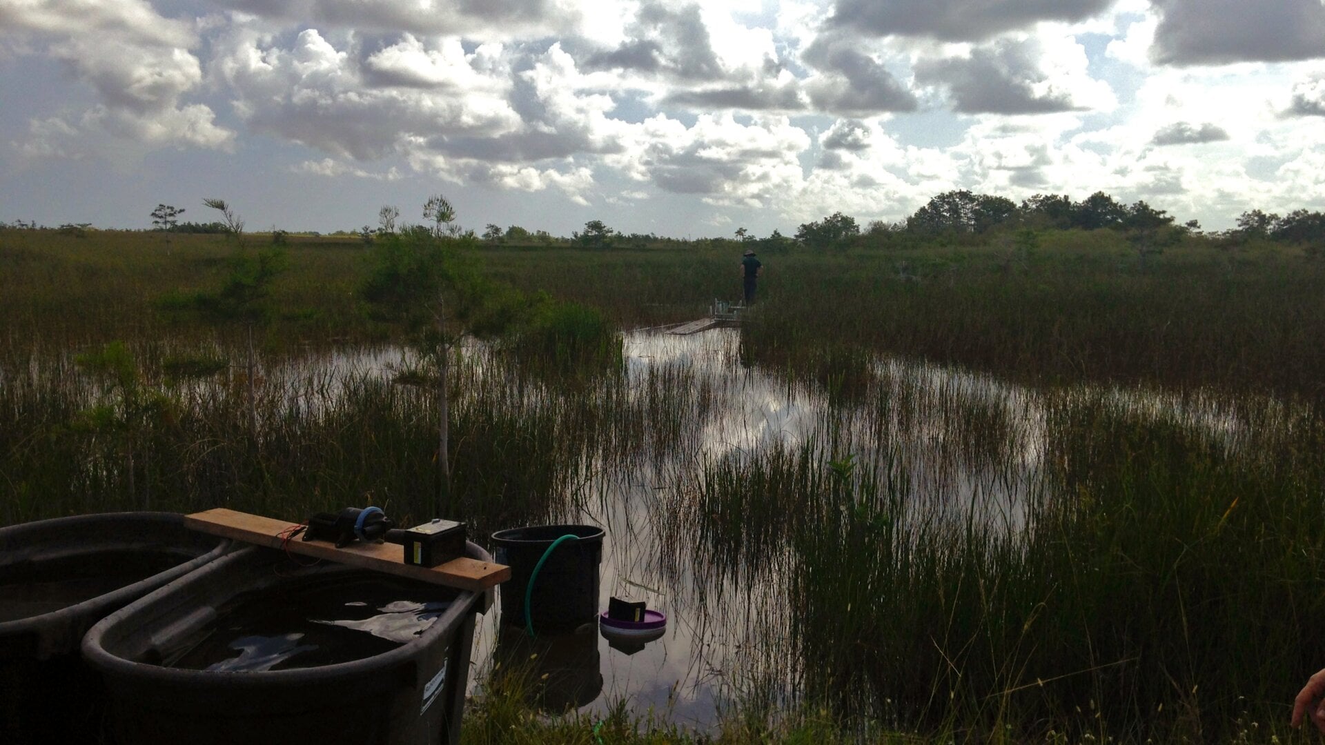 It’s a scorching midsummer day, and the sawgrass is still under a pale blue sky. Waist-deep in water and sinking slowly into the muck, I fend off mosquitos as a man from South Florida’s Water Management District mixes a bag of salt into a hot tub-sized bucket on the side of the road. Thirty feet away in the marsh, another city official wearing waders and a bug hat stands on a narrow steel walkway, dangling the end of a long hose over a plexiglass chamber.