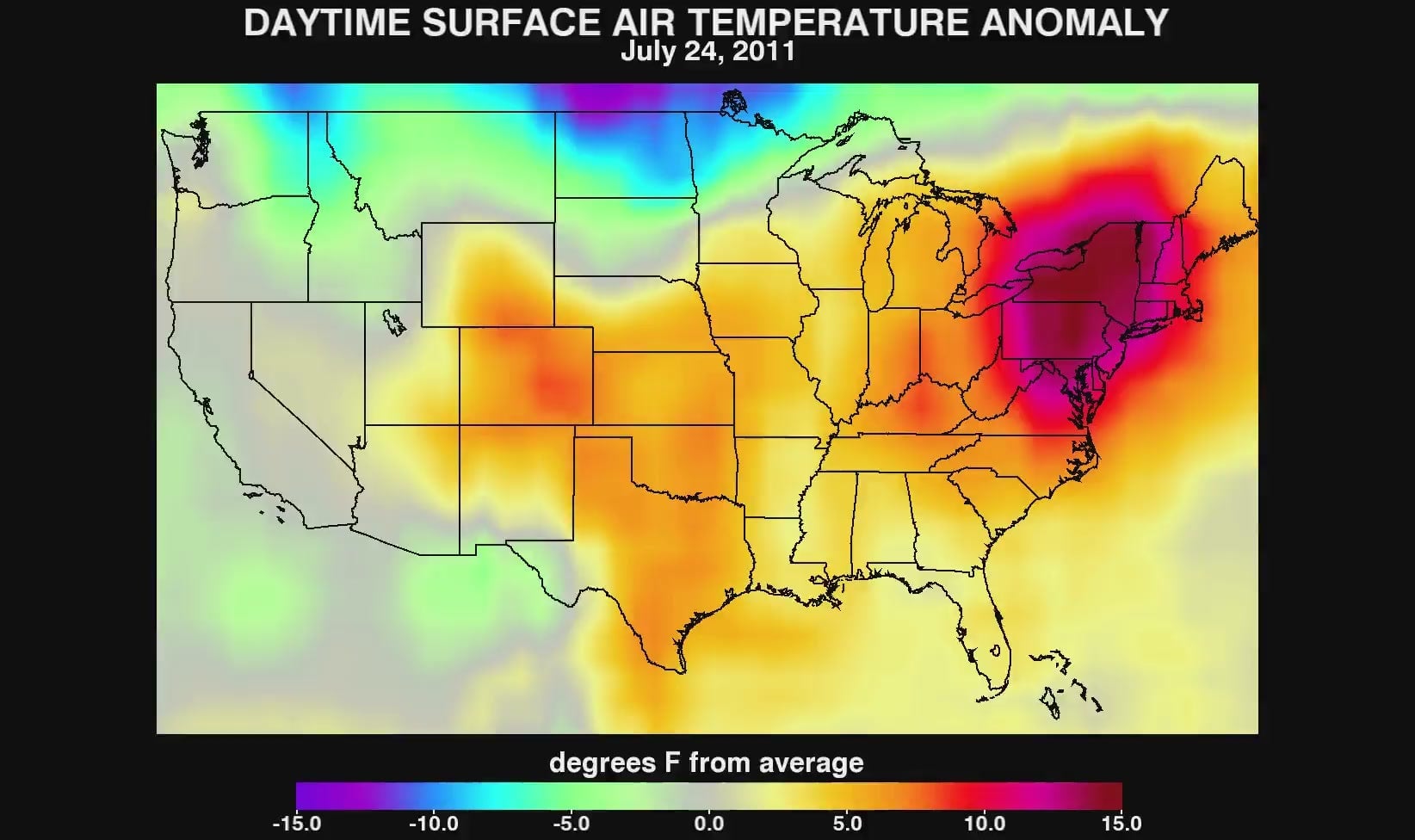 The map above is from NASA’s Earth Observatory, and depicts something called “land surface temperature anomalies” from July 20-27, when the heat wave reached its peak intensity across much of the United States.