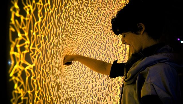 The Firewall is an art installation whipped up by Aaron Sherwood and Mike Allison and is actually made up of spandex, not fire. When you apply pressure, it affects the volume and tempo of the music being played in conjunction. The Firewall’s movement is monitored by a Kinect, and there’s a switch on the frame that allows users to switch between that first, more serene setup and the second more aggressive one.