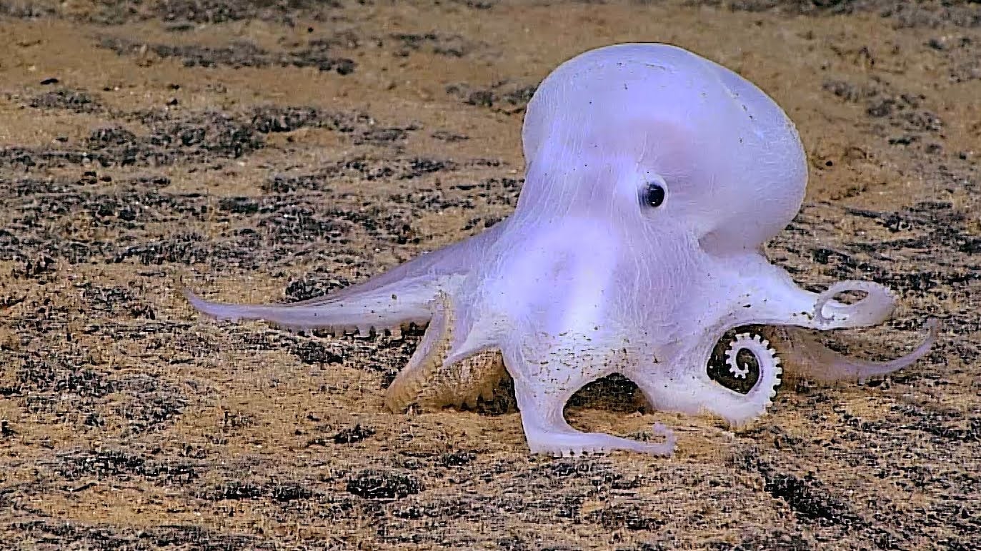 Octopuses, undoubtedly the best creature lurking in the ocean, come in all sorts of shapes and sizes and colors but this one might be gnarliest of them all: it’s a ghost. Or at least it looks like it. Recently spotted in the deep sea 2.6 miles down in the ocean, the octopus could very well be an entirely new species. To my eyes, it’s like a real life cartoon ghost or if the ghosts from Pac-Man came alive.
