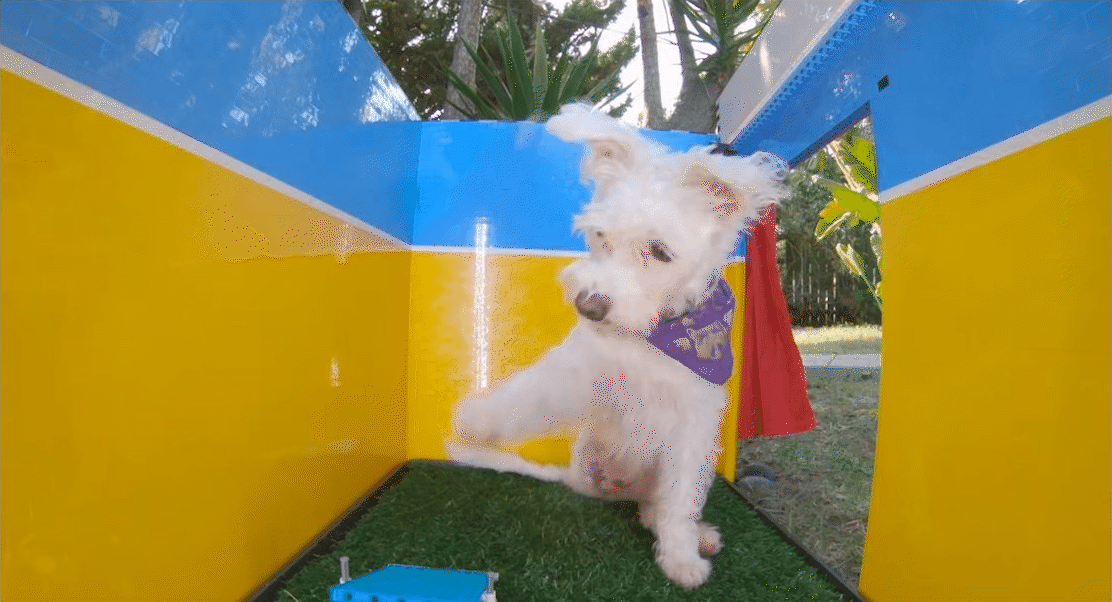 In lieu of other dogs to test out her invention, Giertz built a tiny robot dog out of Legos to snap selfies in the booth as well. Unsurprisingly, it showed significantly less interest in the treats than Scraps did.