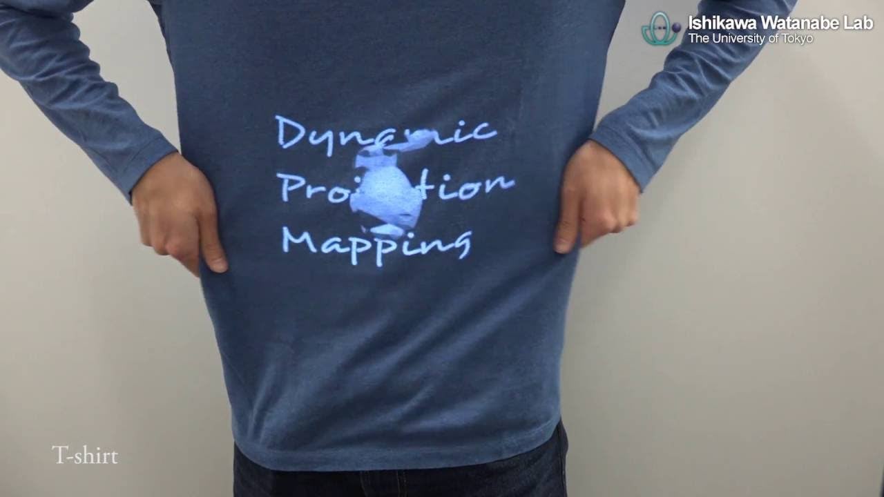 It’s a technique known as projection mapping, and is similar to how textures are applied to 3D models in a video game. But this projector works in the real world, on almost any irregular object, even those with a non-rigid surface. So even when a t-shirt is fluttering away in the breeze from a fan, the projected image on it matches every little move and deformation.