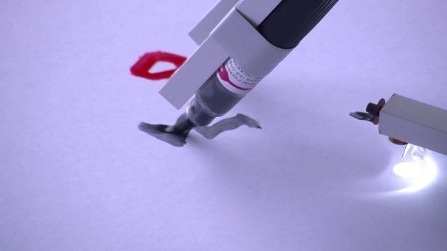 The robot artisté (or the “mobile sensory image production mechanism,” if you want to get technical) was built by Travis Purrington and Danilo Wanner, two MA students in visual communication at the Basel Academy of Art and Design. His parts are fairly simple: two wheels, an Arduino board, a handful of servos, and two aluminum arms that each hold an ink pen. He also has touch and light sensors, which help him search for paper nearby. When he finds it, he selects two colors and goes to town—using a random series of movements generated by his Arduino UNO brain. “Usually he takes two colors that are fairly similar and puts them next to each other,” says a fan in a short mockumentary about the bot. “They provoke a lot of emotions.”