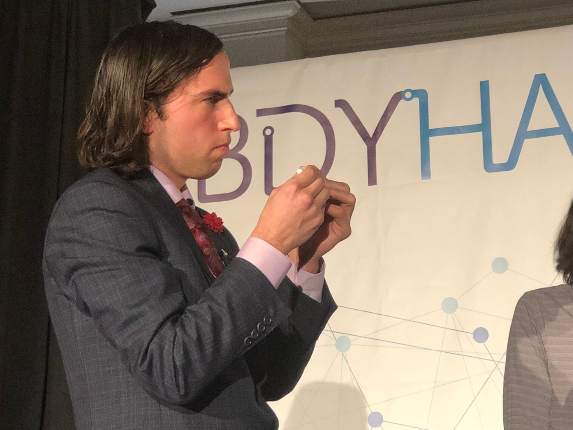 Suddenly, Traywick stopped pacing, turned, and placed his hand on his lapel to pose for a photo, as if in salute. The closing event of the conference, with his self-administered injection at the climax, was about to begin. Four biohackers who had worked on the treatment mounted the stage. Traywick took the mic to pitch his vision.
