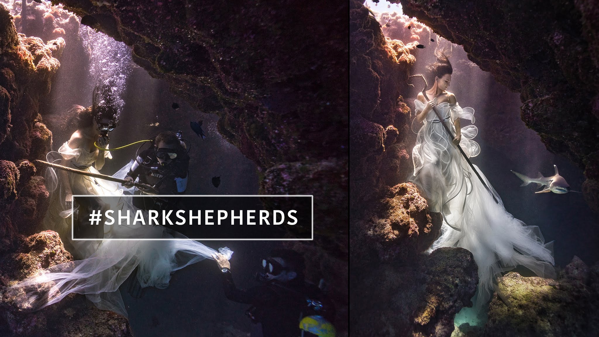 A lovely shepherdess in a flowing white dress tends to her flock in these gorgeous photographs reminiscent of a fairy tale. The twist: the shepherdess is underwater, and her charges are white-tipped reef sharks.