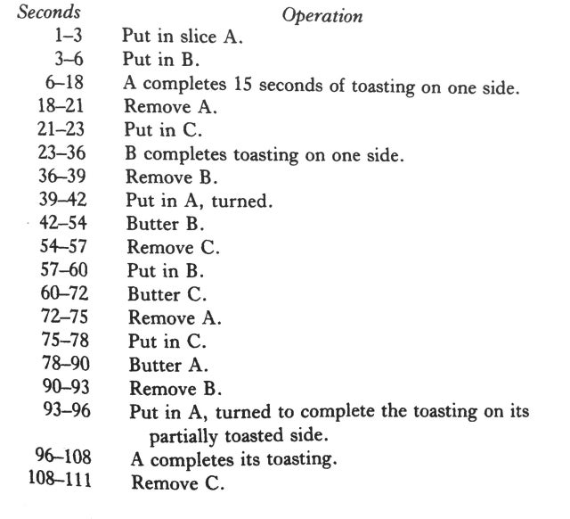 Last week, I asked you to determine the shortest amount of time in which three slices of bread could be toasted and buttered.