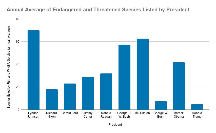 Fish and Wildlife Services data shows Trump has approved an average of roughly five species per year for Endangered Species Act protections over his four years in office. By comparison, Obama declared roughly 42 species per year endangered or threatened over eight years. George W. Bush clocked in at a little over seven per year, which was the former nadir prior to Trump.