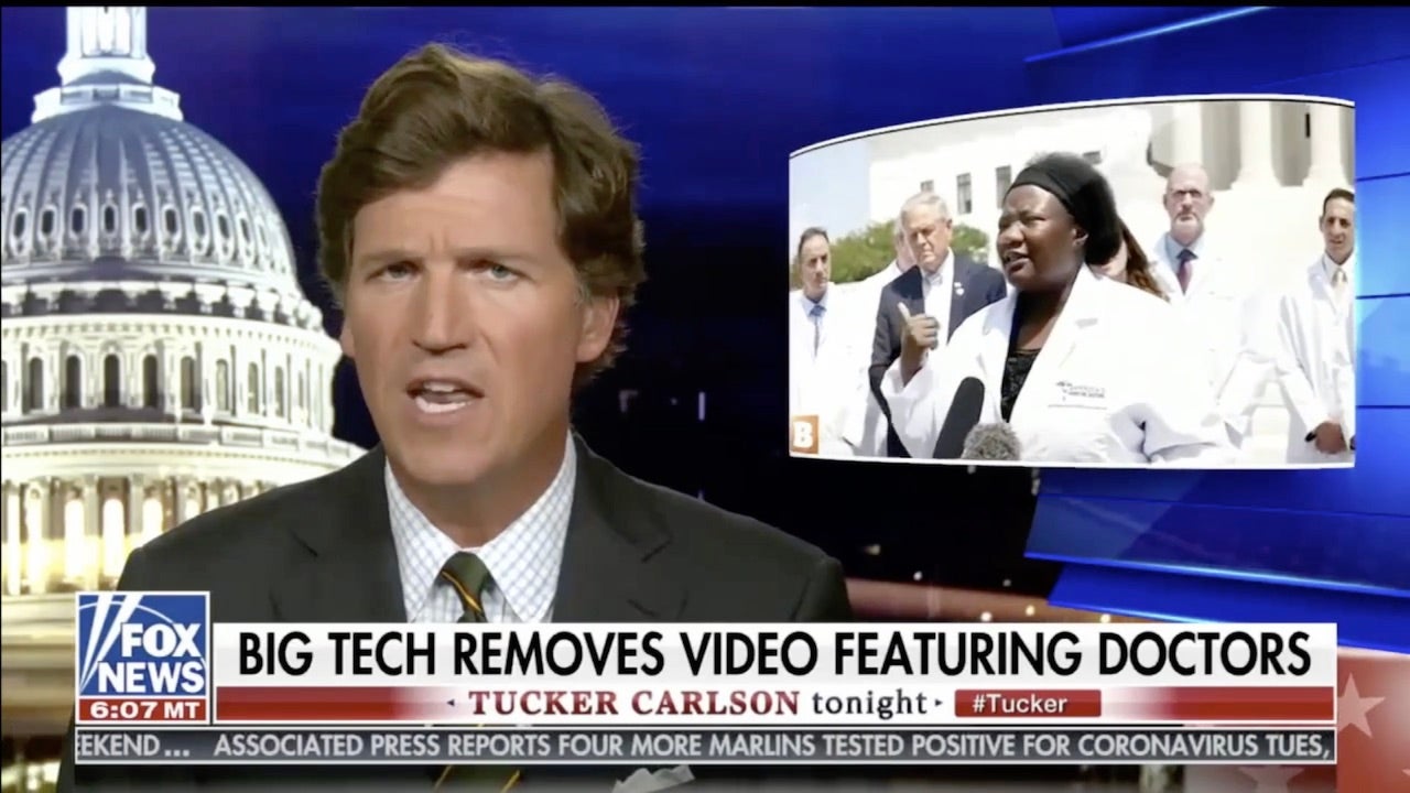 Fox News host Tucker Carlson lashed out at tech companies and reporters Tuesday night, insisting that a pro-Trump group called “America’s Frontlines Doctors” was being censored and improperly ridiculed for their beliefs. Carlson, of course, is full of shit.