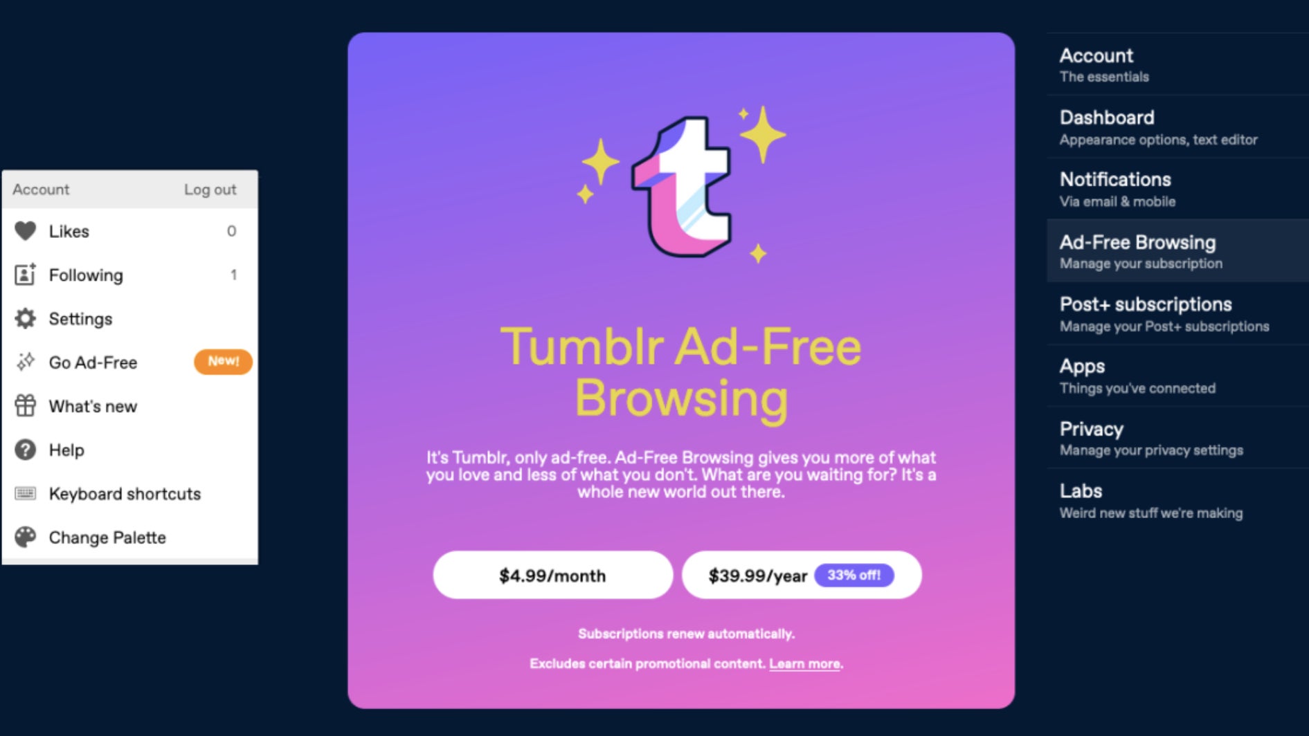 Unsurprisingly, it’s going to cost you (Tumblr has to make up for those lost ad dollars in some way, after all). On Thursday, the social media platform announced new subscription options for users who “love Tumblr but hate ads.” For $4.99 a month, or $39.99 a year, Tumblr will allow users to set up ad-free browsing on desktop and mobile. The opt-in subscriptions are now available for purchase worldwide.