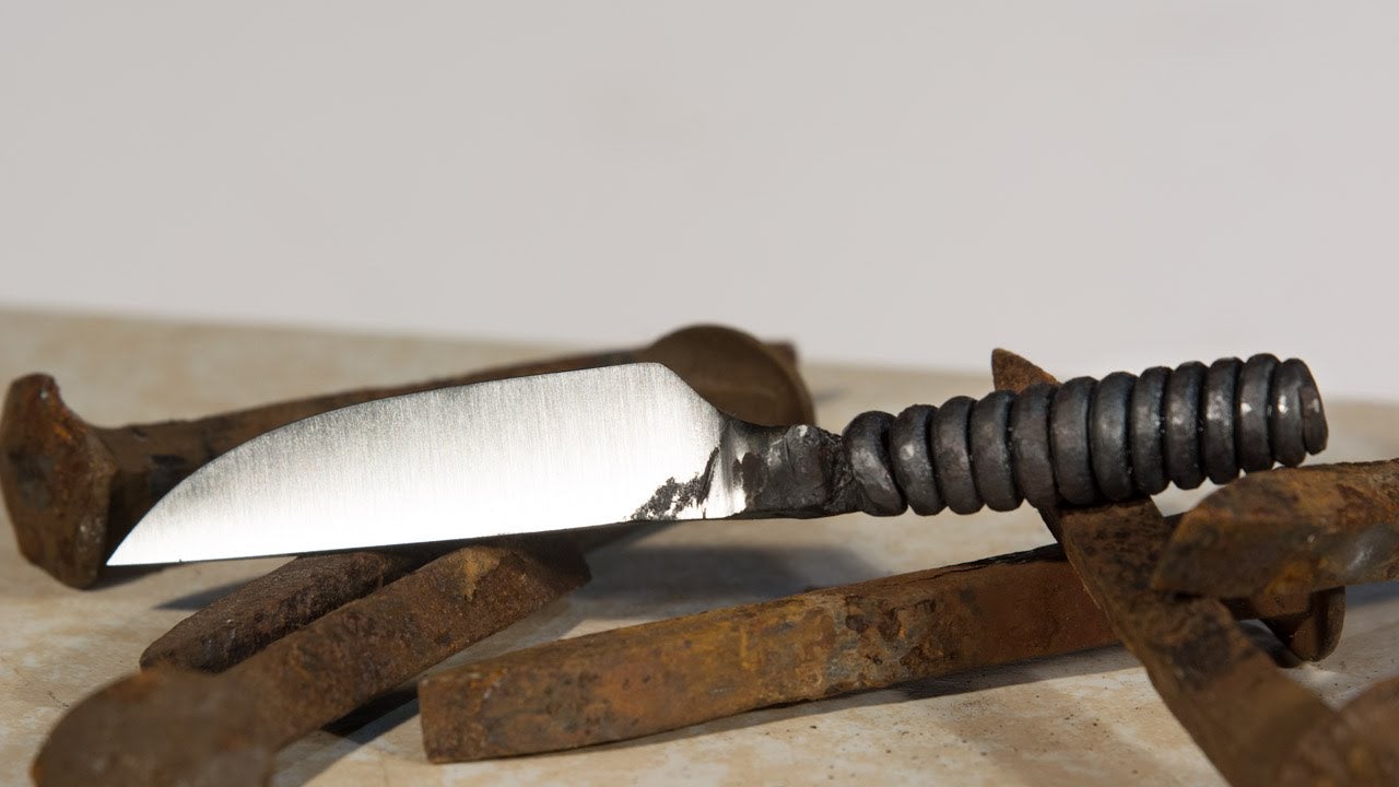 Watch as bladesmith Walter Sorrells turned a railroad spike into a knife. Railroad spikes aren’t meant to be used as an edge tool but it’s cool to see Sorrells bludgeon the crude spike into a pretty awesome knife with a coil for a grip. The metal coil was created by elongating the spike and wrapping it around and around a mandrel.