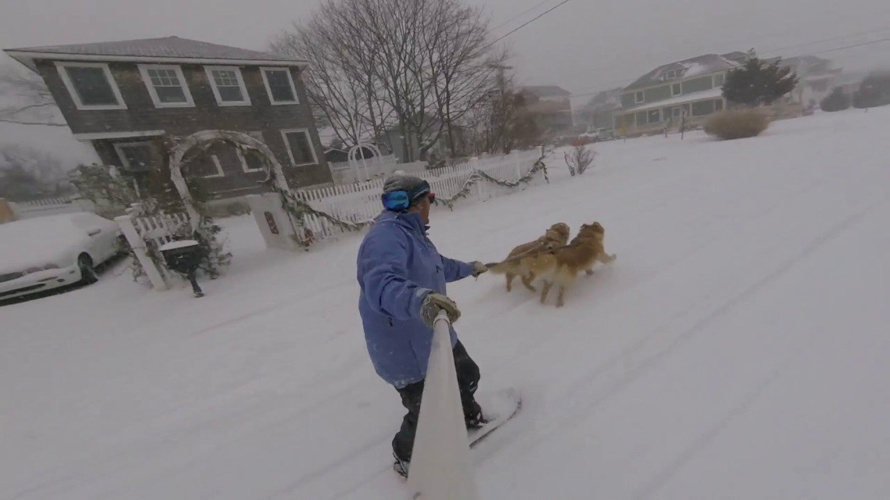 Barney and Cabot are golden retrievers. The man on the snowboard is Barney and Cabot’s dad. Barney and Cabot’s dad is using his good boys as transportation. Barney and Cabot are in an fluffy wonderland of unbridled joy. Barney and Cabot’s dad can be forgiven for using a selfie-stick because he is filming Barney and Cabot, and no negativity can survive the overwhelming goodness of Barney and Cabot.