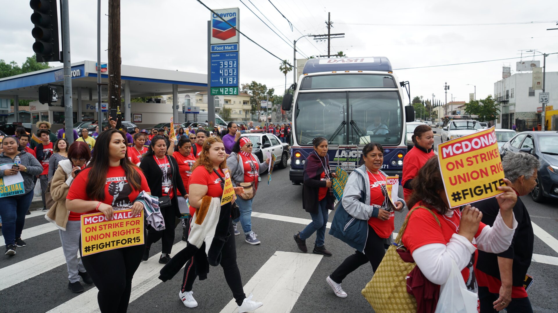 Around 100 rideshare drivers protested their working conditions this afternoon in Los Angeles, engaging in a “take over” of an Uber Hub, before joining up with a contingent of fast food workers from McDonald’s who were striking for the right to unionize.