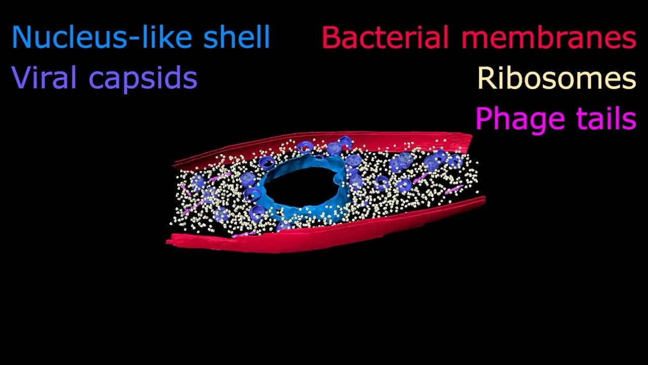The scientists first stuffed their test bacteria full of proteins that fluoresce under a special microscope, attached to other proteins that are important to the viral lifecycle. When they introduced the viruses to the bacteria, they filmed as the fluorescing proteins enveloped the viral genetic material into a sort-of nucleus—bacteria don’t have nuclei to store their DNA like our cells do. Another protein remained outside the shell and held the gene-sack in place. The team finally froze the bacteria so they could study them with higher-detail cryo-electron tomography, said Chaikeeratisak. They published their results today in the journal Science.