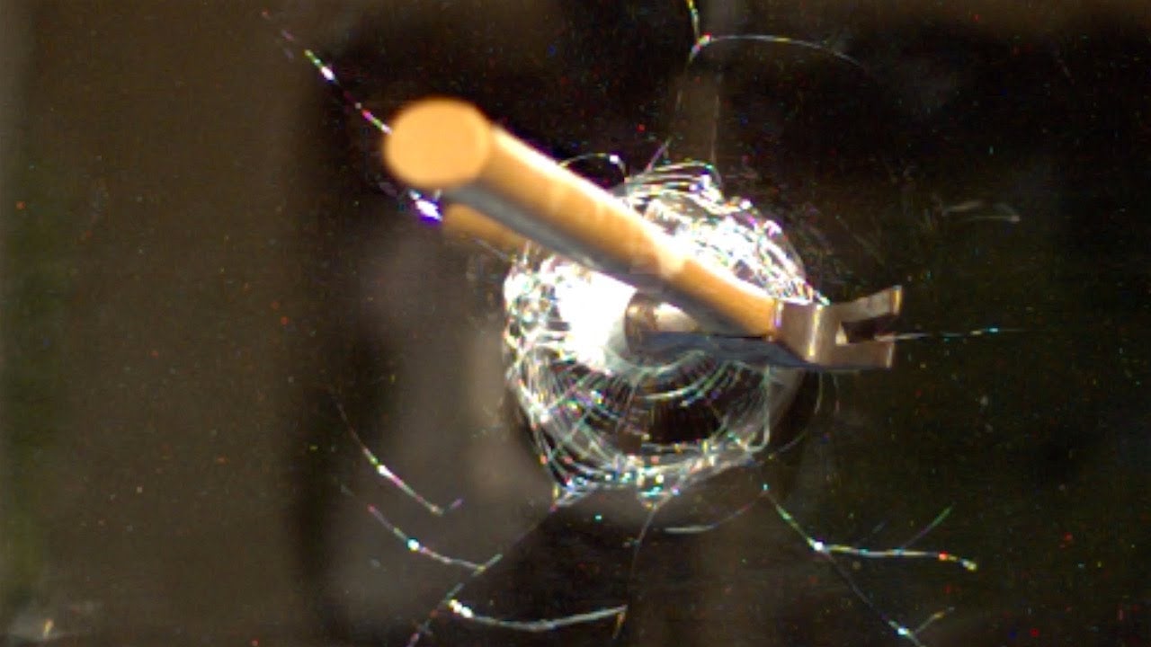This time around, a hammer appears to fly through a mirror instantaneously, as the camera captures it at 120,000 frames-per-second. However, when the video is slowed down, you can actually see some crazy nuanced shockwaves ripple through the material. As the head of the hammer hits the glass, there’s an instant circular breakage around the contact point. Then come some poetic images of the sun catching its reflection in the flying mirror pieces, while rainbow spots come through.
