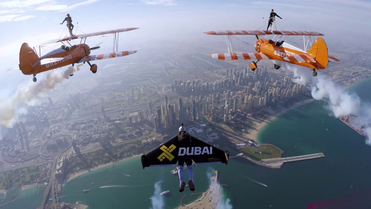 One, because they’re probably the only people crazy enough to fly with you like that. And two, well, it just looks dope as hell to see Jetman flying next to wingwalkers over Dubai.