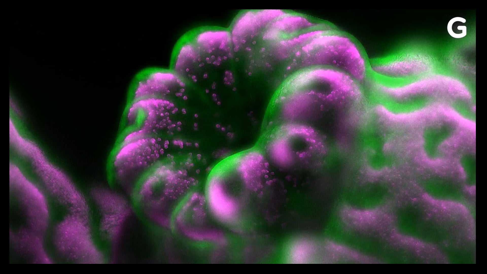 Laissue’s video captures a coral polyp, the smallest individual unit of coral life, popping out of a staghorn coral, as well as the algae with which the coral has a symbiotic relationship. These corals are sensitive to light, so Laissue needed to develop a new low-light microscopy technique in order to capture the video.