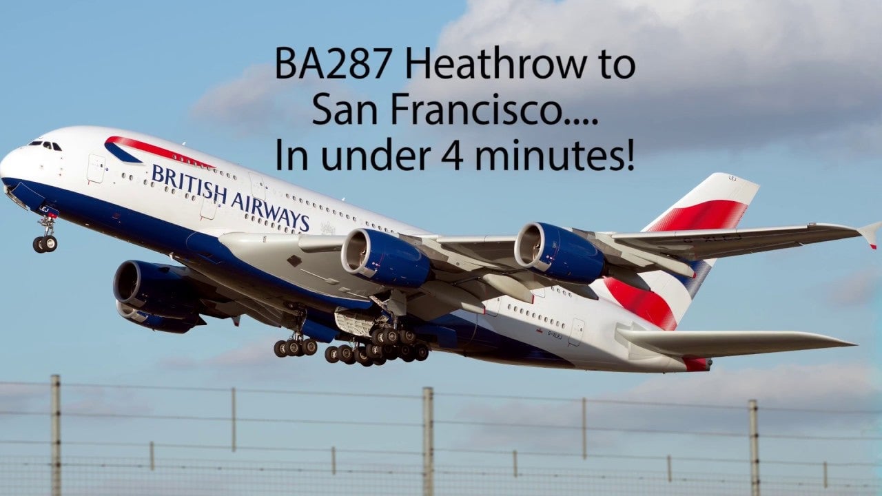 This timelapse was captured by British Airways pilot Dave Wallsworth on an Airbus A380 and includes a westerly sunrise as the plane races towards San Francisco. If you crunch the numbers, actually making the 5,353-mile trip from London’s Heathrow airport to San Francisco International in four minutes would require an airspeed just above 80,300 miles per hour. Buckle up.